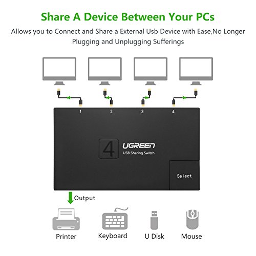 UGREEN USB 2.0 Sharing Switch 4 Port, USB Peripheral Switcher Adapter Box Hub 4 PCs Share 1 USB Device for Printer Scanner with 4 Pack USB 2.0 Male Cable