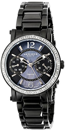 -. Binding : Watch -. Brand : Akribos XXIV -. Department : womens -. EAN : 0815947011664 -. Feature : Powered by a reliable Swiss Quartz movement the watch features unique stainless steel skeletal hands with luminous tips / Thirteen genuine diamonds surrounding the subdials along with inlaid Czech stone dotting the stainless steel bezel give this watch shine / The genuine Mother-Of-Pearl dial features two subdials, date at the 3 o'clock position and the weekday is displayed at the 9 o'clock position. / Stainless steel Arabic numeral 6 and 12, stainless baton hour indices; Two year manufactures warranty / Water resistant to 165 feet (50 M): suitable for swimming and showering -. IsAdultProduct : 0 -. Label : Akribos XXIV -. Manufacturer : Akribos XXIV -. Model : AKR472BK -. MPN : AKR472BK -. PackageQuantity : 1 -. PartNumber : AKR472BK -. ProductGroup : Watch -. ProductTypeName : WATCH -. Publisher : Akribos XXIV -. Studio : Akribos XXIV -. Title : Akribos XXIV Women's AKR472BK Lady Diamond Collection Diamond Swiss Day and Date Watch -. UPC : 815947011664
