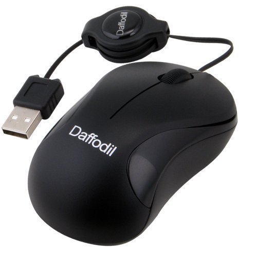 Daffodil WMS108B Wired Optical Mouse - 3 Button PC Mouse with Scrollwheel and Retractable USB Cable - For Laptop / Netbook / Desktop Computers - Supported by: Microsoft Windows (7 / XP / Vista) and Apple MAC (OS X +) - No Batteries Needed
