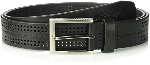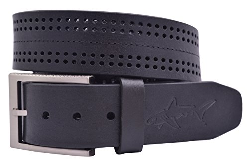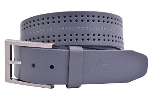 Men's 38mm wide Greg Norman performance golf belt with matching center stitch and four rows of perforations, elongated silver finish buckle with textured sides. Embossed with shark logoFeature