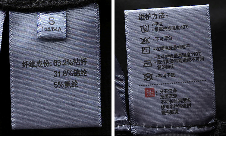 | 洗涤标准: | 不可浸泡不可漂白悬挂晾干40℃以下手洗110℃以下反面熨烫不可干洗 |