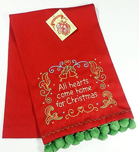 Cotton Christmas Embroidered Dish Towel, Fringed - 15" x 22.5", Hearts Come Home For Christmas