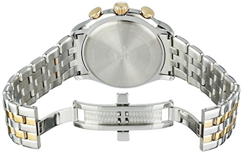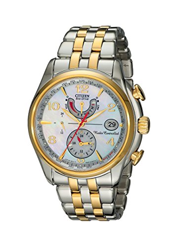 -. Feature : Two-tone stainless steel watch featuring mother-of-pearl dial, gold-tone markers, and perpetual calendar window at 3 o'clock / Light-powered Eco-drive Japanese quartz movement with analog display / Protective antireflective-sapphire crystal dial window / Features deployment clasp with push-button, automatic time for 26 time zones, calendar, subdials for day, alarm, 24-hour time, and power reserve indicator / Water resistant to 330 feet (100 M): suitable for snorkeling, as well as swimming, but not diving