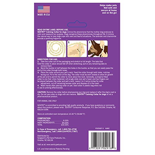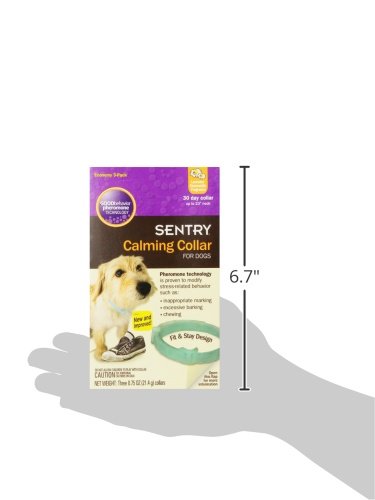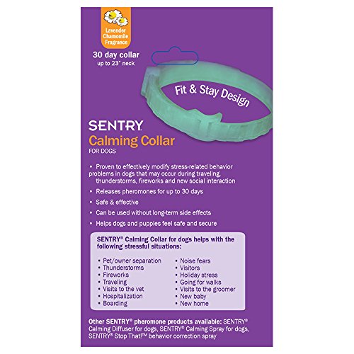 SENTRY Calming Collars use patented GOOD Behavior pheromone technology. Using a pheromone that mimics the one mother dogs produce to calm their puppies, the collars are clinically proven to reduce or eliminate stress-related behavior such as inappropriate marking, excessive barking and chewing. Collars help alleviate problem behaviors triggered by travel, thunderstorms, fireworks, being left alone and new social situations. This collar continues to release calming pheromones for your dog for 30 days. It can be used for dogs of all ages and breeds without long-term side effectsFeature