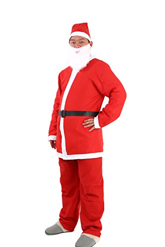 -. Feature : Package Contents : The Santa Claus Suit contains 5 Pieces. Comes with Christmas Hat, Jacket, Beard, Belt and Trousers. / Nice Design: Adult pub crawl Santa jacket trimmed with white faux fur and black belt. The color look full. The pants designed to be tucked inside boots. Meanwhile, the suit along with matching hat. Save you time to prepare the Santa suit. / Feel Comfortable: The Santa suit is well made. Its light weight allow you wear for a long time. It not increases much extra burden for you. / One Size: One Size fits more! ( In Inch )Pants Length=40.5, Pants Waist Length=21, Cloth Length=33, Sleeve Length=25. Please allow 1-3inch measuring deviation due to manual measurement. / Main Meaning: The most important part of Santa Claus is making the children happy. This suit is an investment sure to bring smiles to all kids around you.