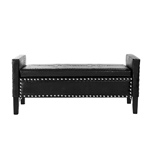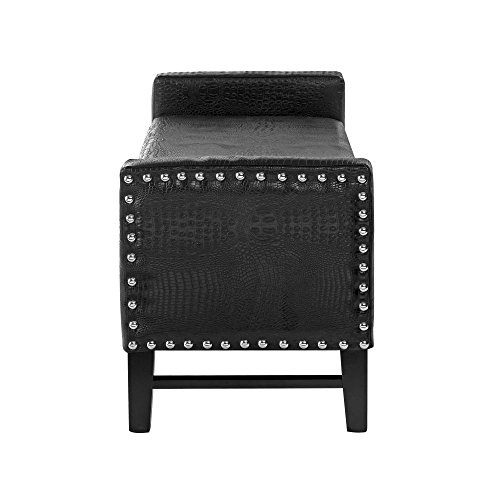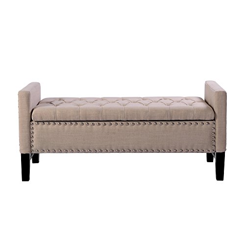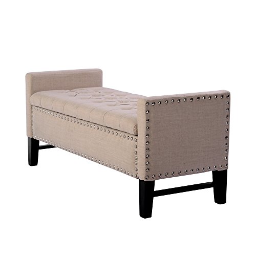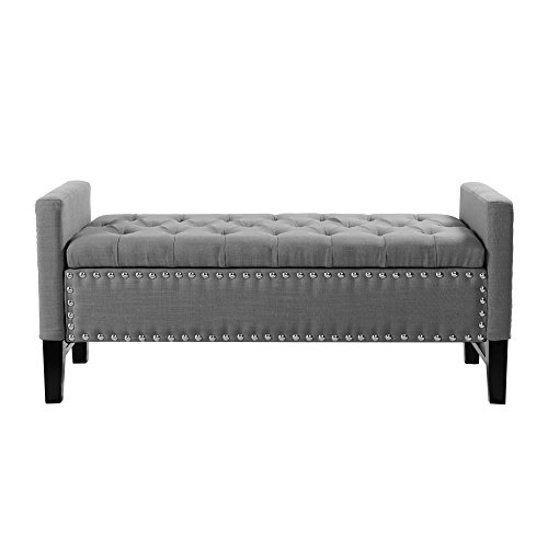 -. Brand : Iconic Home -. Feature : Country cottage linen storage bench / Dark grey linen seat with built in storage on solid birch legs with X design / Chic silver nailhead trim and button tufting for added style and comfort / Kid friendly adjustable safety hinged lid reveals spacious storage compartment / High density foam seating -. Label : Iconic Home -. Manufacturer : Iconic Home -. Model : Lance -. ProductGroup : Furniture -. ProductTypeName : HOME_FURNITURE_AND_DECOR -. Publisher : Iconic Home -. Studio : Iconic Home -. Title : Iconic Home Lance Modern Button Tufted Storage Bench
