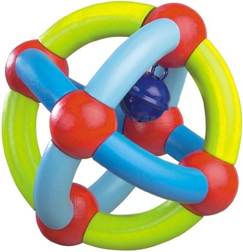 This clutching toy includes a little bell. Wooden parts a threaded on an elastic band and can be moved and manipulated. Made in Germany.