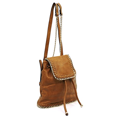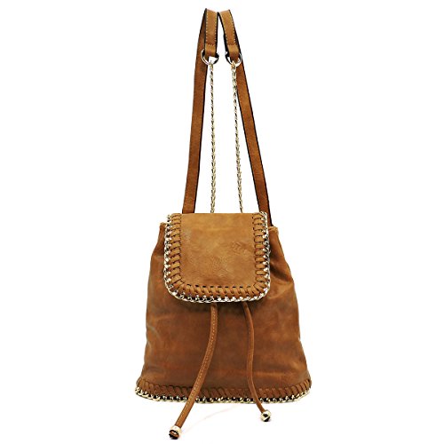 Synthetic leather with gold-tone chain trim. Adjustable backpack straps. Magnetic snap over drawstring closure. Lined inside compartment. Interior zip and pockets.