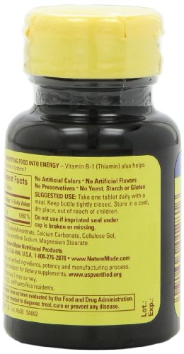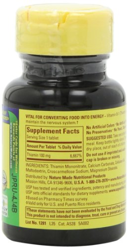 -. Binding : Health and Beauty -. Brand : Nature Made -. Label : Nature Made -. Manufacturer : Nature Made -. ProductGroup : Health and Beauty -. ProductTypeName : HEALTH_PERSONAL_CARE -. Publisher : Nature Made -. Size : mg -. Studio : Nature Made -. Title : Nature Made Vitamin B1, 100mg, 100 Tablet