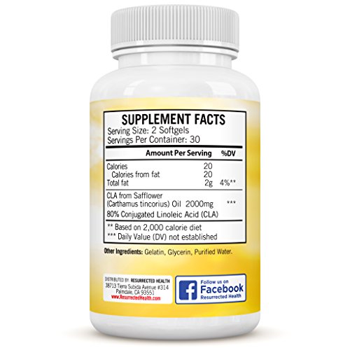 -. Binding : Health and Beauty -. Brand : Resurrected Health -. EAN : 0601844692941 -. IsAdultProduct : 0 -. Label : Resurrected Health -. LegalDisclaimer : These statements have not been evaluated by the Food and Drug Administration. This product is not intended to diagnose, treat, cure or prevent any disease. -. Manufacturer : Resurrected Health -. MPN : None -. PackageQuantity : 1 -. PartNumber : None -. ProductGroup : Health and Beauty -. ProductTypeName : HEALTH_PERSONAL_CARE -. Publisher : Resurrected Health -. Studio : Resurrected Health -. Title : CLA 2000mg Extra Potent Weight Loss Supplement - Standardized to 80% CLA - Natural Fatty Acid that Helps Increase Lean Muscle Mass and Burn Fat - Conjugated Linoleic Acid made 100% from Safflower Oil -. UPC : 601844692941