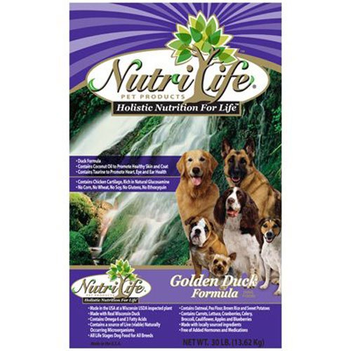 Nutri Life, 30 LB, Golden Duck Formula, Duck Dog Food, Bagged. Nutri Life Gold Plus dog food formula is for dog lovers who want their dog to have a food where the ingredient panel is as appetizing for people as it is for dogs. Nutri Life Active dog food is formulated for dogs that have higher energy requirements. It contains No Corn and No Wheat to help avoid possible allergic reactions. In addition to fresh meat, All Gold has added probiotics, prebiotics and yucca to help promote excellent gastrointestinal health. Nutri Life dog food is formulated for All Life Stages.Feature