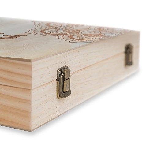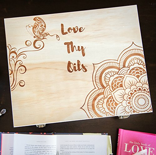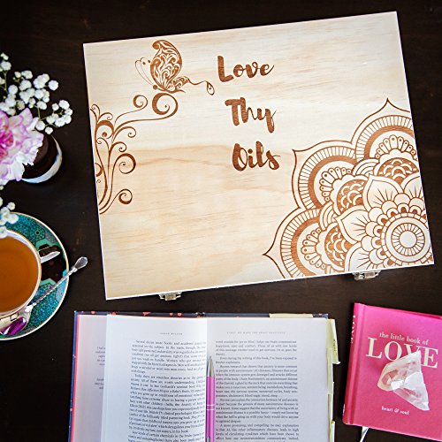 - A BEAUTIFUL ACCESSORY FOR YOUR OILS: Collecting aromatherapy oils can take a lot of time and money. Not only did we want to create a box holder that protected your collection - we wanted it to be as beautiful as the aromas within. This elegant wooden box is made from durable pine wood and is gorgeous from the inside out. When closed, the top displays a bohemian-style flower and butterfly pattern with our mantra engraved in dark brown, contrasted by the multifaceted light pattern of the pine.