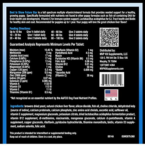 Future Star Puppy Vitamins & Minerals is a full spectrum multivitamin and mineral formula that provides needed support for a healthy, growing puppy. Future Star Puppy Vitamins & Minerals is specifically formulated with key nutrients not found in other puppy formulas such as fish oil containing DHA for brain health and development, Vitamin C for immune system support, Lactobacillus Acidophilus for G.I. tract health and Biotin for healthy skin and coat. Future Star Puppy Vitamins & Minerals is recommended for puppies up to 1 year of age. Your puppy will love the great chicken liver flavor. Feeding Directions: Give 1 tablet per 20 lbs of body weight, daily.Feature