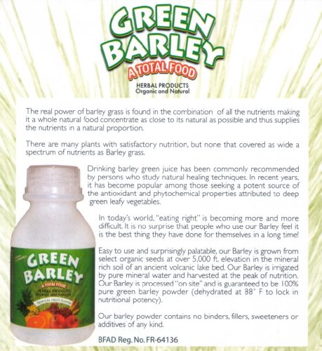 Studio : Herbal Products (Phils.) Publisher : Herbal Products (Phils.) Binding : Health and Beauty Product Description GREEN BARLEY Gives Your Body's Natural Healing Process a Boost to Heal and Fight Back against Diseases, Infections, Deficiencies, Unnatural Cell Growth and Toxic Chemicals Try One Bottle and you will experience an Immediate Physical Health Improvement. Contents: Net Weight - 20 grams 0