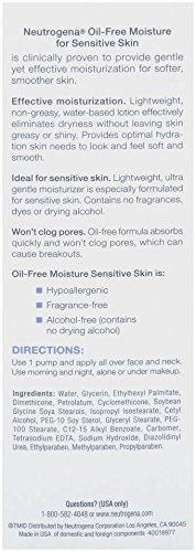 ultra-gentle facial moisture Moisturizes dry areas and controls shine in oily areas. Non-Comedogenic.á Dermatologist Recommended. Neutrogena Oil-Free Moisture foráSensitive Skin is clinically proven to provide gentle yet effective moisturization for softer, smoother skin. Effective moisturization. Lightweight, non-greasyáwater-based lotion effectively eliminates dryness without leaving skin greasy or shiny.á Provides optimal hydration skin needs to look and feel soft and smooth.áIdeal for sensitive skin. Lightweight, ultra gentle and irritant-free moisturizer is especially formualted for sensitive skin.á Contains no fragrances, dyes or drying alcohol. Won't clog pores. Oil-free formula absorbs quickly and won't clog pores, which can cause breakouts. Oil-Free MoistureáSensitive Skin is: Hypoallergenic Fragrance-free Alcohol-free (contains no drying alcohol) As part of your daily skincare regimen, the following Neutrogena products are recommended: Extra Gentle Cleanser Alcohol-Free Toner Made in USAFeature
