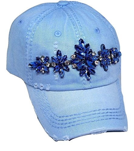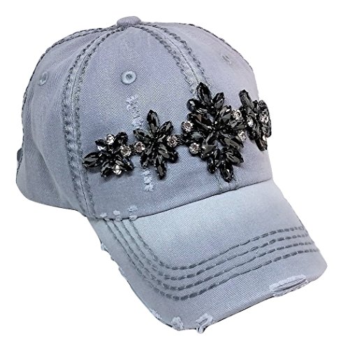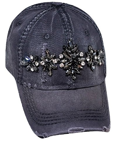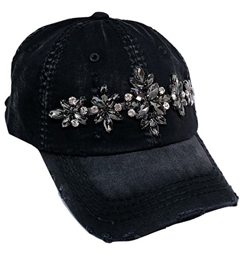 Product Description Distressed glitz Zoey baseball cap by Olive Pique. Stone flower design provides lots of sparkle. Fully adjustable back features synthetic leather buckle back. 0