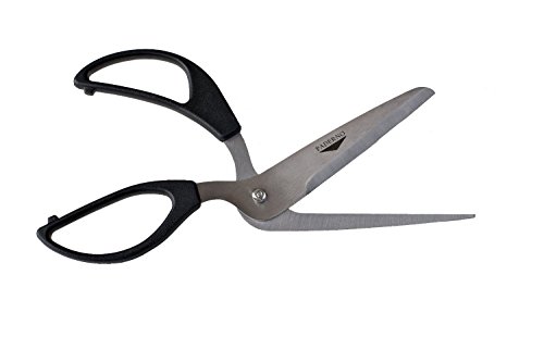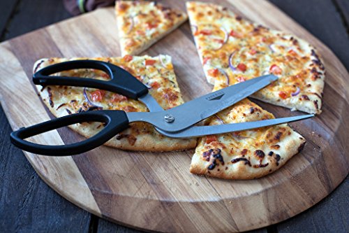 The Paderno World Cuisine offset pizza scissors are constructed of professional grade stainless steel blades and high-quality plastic handles for comfort. Unlike traditional kitchen scissors that position your hand at an uncomfortable angle for cutting, the Paderno World Cuisine offset pizza scissors are manufactured to provide a more correct cutting angle. The offset design allows your hand to remain elevated and away from the food, while the bottom blade remains perfectly flat on the cutting surface. This unique design prevents the tearing of delicate crusts and toppings by allowing effortless cutting and movement of the blades through the pizza. The interlocking blades can be separated for ease of cleaning and avoids food particles from becoming lodged in between the scissor blades.