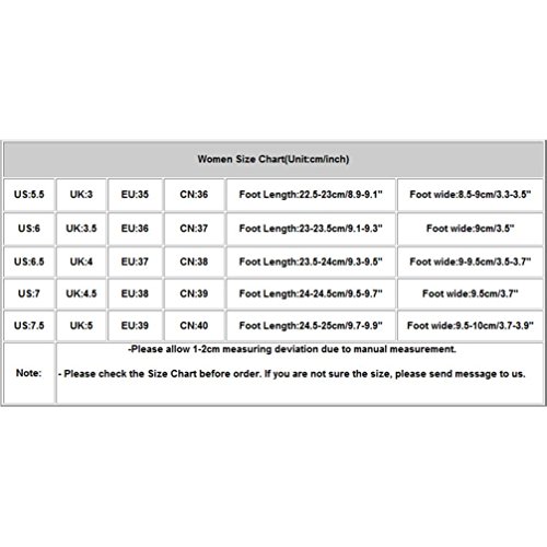 Studio : Sikye Publisher : Sikye Product Description Package: 1 Pair Women Shoes(Not including shoebox) NOTE: As different computers display colors differently,the color of the actual item may vary slightly from the above images. US:5.5 UK:3 EU:35 CN:36 Foot Length:22.5-23cm/8.9-9.1" Foot wide:8.5-9cm/3.3-3.5" US:6 UK:3.5 EU:36 CN:37 Foot Length:23-23.5cm/9.1-9.3" Foot wide:9cm/3.5" US:6.5 UK:4 EU:37 CN:38 Foot Length:23.5-24cm/9.3-9.5" Foot wide:9-9.5cm/3.5-3.7" US:7 UK:4.5 EU:38 CN:39 Foot Length:24-24.5cm/9.5-9.7" Foot wide:9.5cm/3.7" US:7.5 UK:5 EU:39 CN:40 Foot Length:24.5-25cm/9.7-9.9" Foot wide:9.5-10cm/3.7-3.9" 0