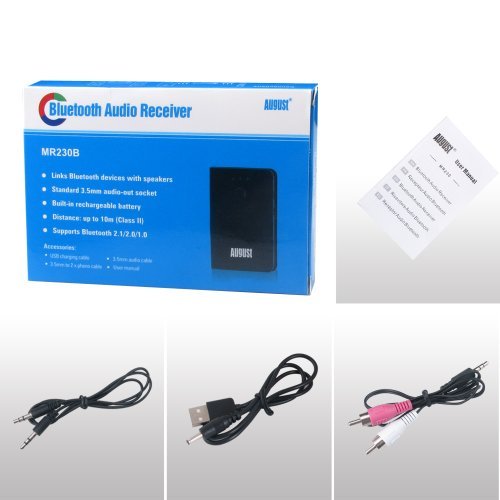 -. Binding : Electronics -. Brand : August -. Color : Black -. EAN : 5053047002150 -. Feature : Bluetooth Music Receiver - Make any stereo a Bluetooth sound system capable of wirelessly playing music from your mobile, iPhone, PC, MP3 player / Plug & Play System - Pairs to your Bluetooth device simply and swiftly / Stereo Phono Cable - transform your Hifi speakers and stereos into bluetooth devices / Standard 3.5mm Audio Out - Compatible with any car stereo or speaker with 3.5mm audio socket / Built In Rechargeable Battery - Works anywhere and can easily be recharged using a USB port -. Label : August -. Manufacturer : August -. Model : MR230B -. MPN : MR230B -. PackageQuantity : 1 -. PartNumber : MR230B -. ProductGroup : Speakers -. ProductTypeName : RECEIVER_OR_AMPLIFIER -. Publisher : August -. Studio : August -. Title : August MR230B Bluetooth Audio Receiver for Sound Systems - Bluetooth Wireless Music Adaptor for Hifi Speakers / Home Stereo / Headphones / Portable Speakers - Bluetooth Enable your Audio Devices - Black