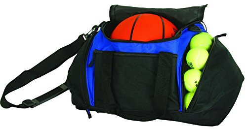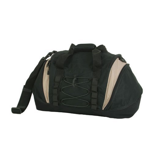 -. Feature : FEATURES: Zippered main compartment, zippered front pocket, rear elastic rope & ring holders, two large zippered side compartments, adjustable/detachable shoulder strap. / MATERIAL: 600D Polyester / SIZE: 21-3/4" X 11-1/2" X 12-1/2" / COLORS: Black/Royal, Black/Red, Black/Gold, Black/Khaki. / INTENDED USE: GYM, SPORTS, TRAVEL, LAGE BAG
