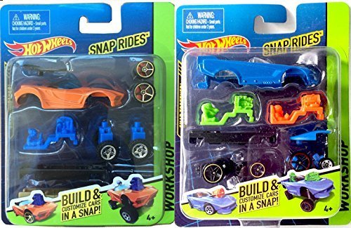 -. Feature : Snap Rides 2 Pack Custom Blue Racer Car Kit + Snap Ride Custom Orange Race Car Kit / Create customized Hot Wheels & Race on tracks / Includes a variety of body parts, wheels, accessories and decals--that combine in a snap! / Compatible with other Snap Rides vehicles for imaginative combinations / Connects to other Hot Wheels track sets & Create multiple variations.