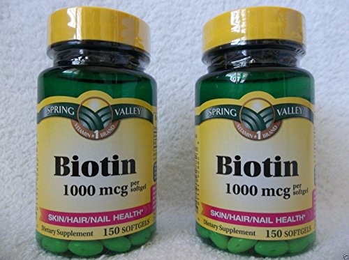 Give your hair, skin and nails a boost with the Spring Valley Biotin Softgels, which come in a 150-count bottle of 1000 micrograms per tablet. This B-vitamin is often used to help manage diabetes, brittle nails and other conditions. The Spring Valley biotin supplement can be taken daily. Spring Valley Biotin Softgels, 1000mcg, 150 count: · Spring Valley biotin contains 1000 mcg per softgel tablet · For healthy hair, skin and nails Ingredients: Biotin, Dicalcium Phosphate, Cellulose, Vegetable Magnesium Stearate, Calcium Silicate, Silica, Croscarmellose, Cellulose CoatingFeature