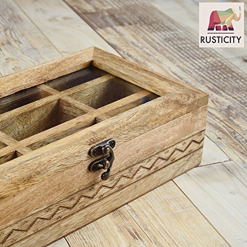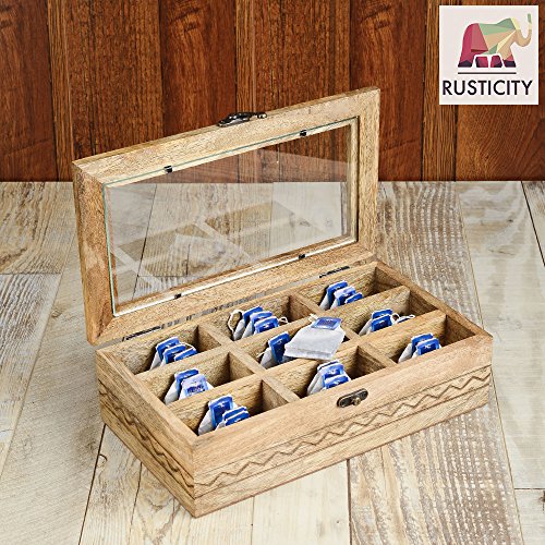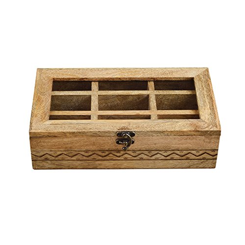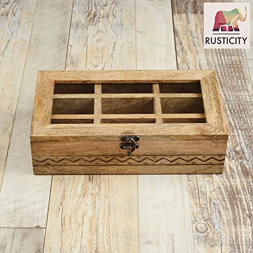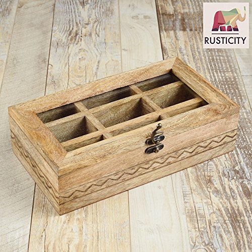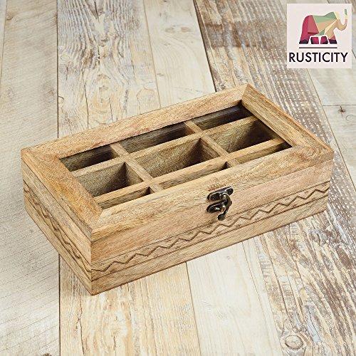 Studio : Rusticity Publisher : Rusticity Binding : Kitchen Product Description Are you exasperated while storing spices in the congested kitchen shelves? Do you need an antique piece to upgrade your wardrobe? This Rusticity Wooden Tea Storage Box will satisfy all your needs. This trinket caddy is made of mango wood and features 9 compartments to organize all items into it. This wooden storage box is the fusion of classic and contemporary designs that upgrades your home decor to next level. This chest organizer is perfect to store personal valuables and serves as a stunning dressing table accessory. The decorative rugged design in this handmade storage chest complements any of your home decor. This condiment spice box with transparent lid ensure it's contents remain safe, free from moisture and scratches. You can view the items without opening the box. Just like your fashion trend, set up your jewelry in order with this jewelry case organizer from the house of Rusticity. You can store your fondest memories, jewelry, accessories, pictures, medicines, trinkets and souvenirs in this storage box. This jewelry box is a safe place to keep your small treasures. This timeless keepsake box will make for a great gift to your loved ones. This compartment box can be placed on a dresser, nightstand or desk. Bring your love, imagination and hospitality in a combo. Put it in this keepsake box to make your guests feel pampered with a gift hamper. This nesting box set makes a charming gift for weddings or housewarming events, especially with a secondary gift inside. The wood can be maintained with ease by wiping it with warm water and a soft cloth. 0
