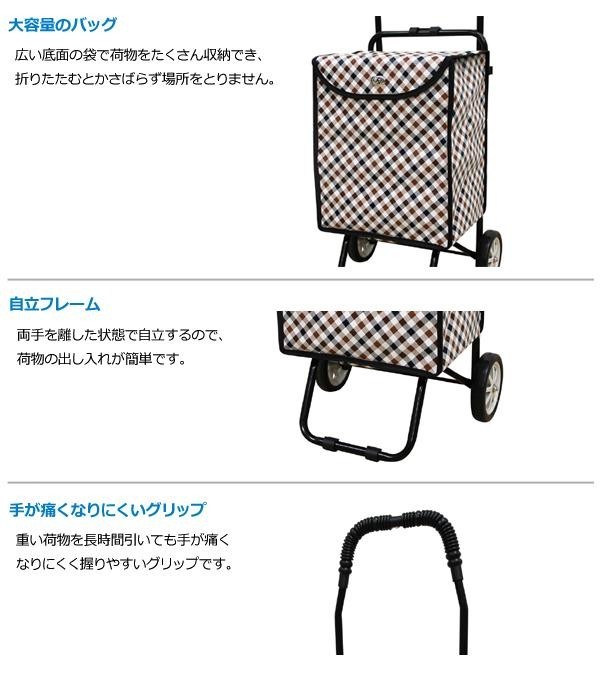 広い底面のバッグは荷物をたくさん収納でき、折り畳むとかさばらず場所を取りません。両手を離した状態で自立するフレームで、荷物の出し入れが簡単。グリップは握りやすく、重い荷物を長時間引いても手が痛くなりにくいので、ちょっと遠くへのお買い物にもオススメです。 |