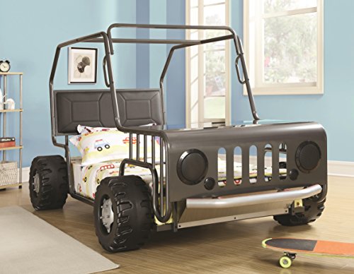 Studio : Hollywood Home Publisher : Hollywood Home Product Description Beep beep! Create a room where your child can have fun, use their imagination as well as rest their head at night. The black leatherette headboard creates a place to rest up against to read a book or finish school work. With wheels, headlights and a frame, this jeep bed is the way to give your child a room where they love to play and sleep. 0