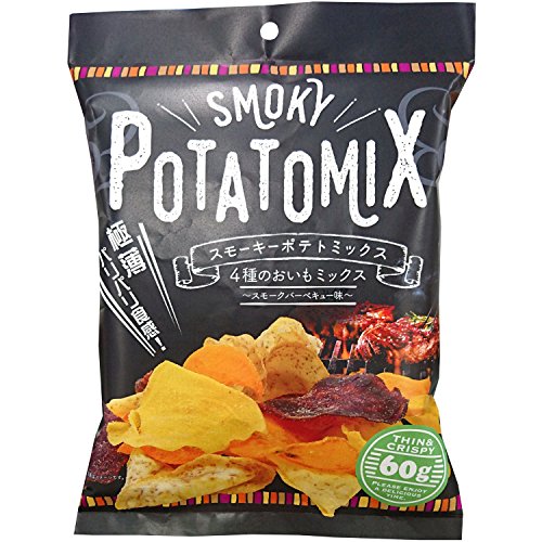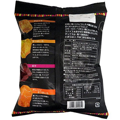 原材料:タロイモ、さつまいも、紫芋、オレンジさつまいも、植物油、スモークバーベキューシーズニング/調味料(アミノ酸等)、香料、微粒二酸化ケイ素、酸味料、(一部に小麦・大豆を含む)