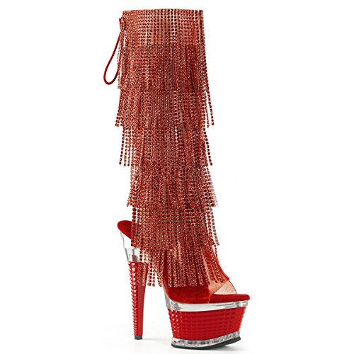 Product Description7 1/2 (16.75cm) heel, 2 1/2 (6.5cm) textured platform open toe/heel back lace-up knee high boot featuring 6-layer chrome plated, simulated rhinestone fringe, inside zip closure0