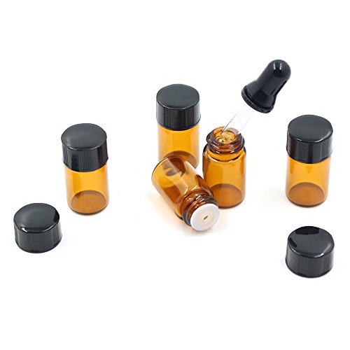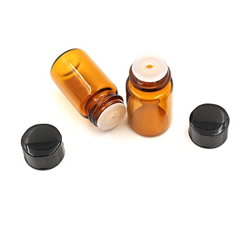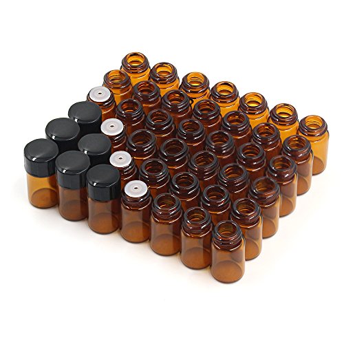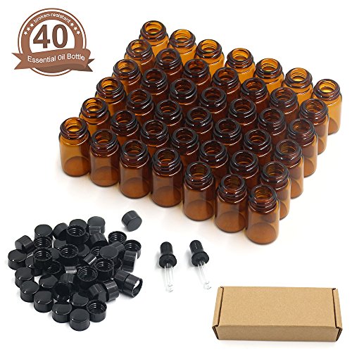 Fomei 40 Packs Oil Bottles for Essential Oils 2 ml (5/8 Dram) Amber Glass Vials Bottles, with Orifice Reducers and Black Caps, With 2 Free Glass Transfer Eye droppers