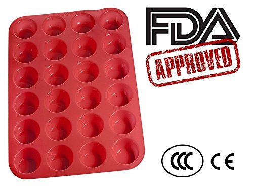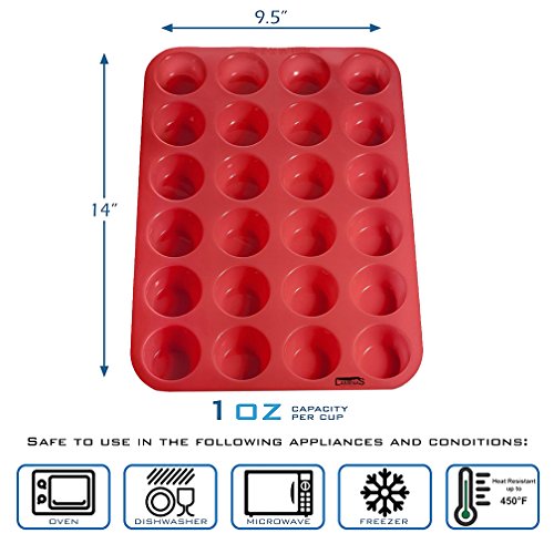 Laminas Silicone Mini Muffin Cupcake Baking Pan 24 Cup Size, BPA Free, Non Stick, Easy To Clean, Oven / Microwave / Dishwasher / Freezer safe, Heat Resistant Up To 450F, Red - Plus Free Recipe eBook