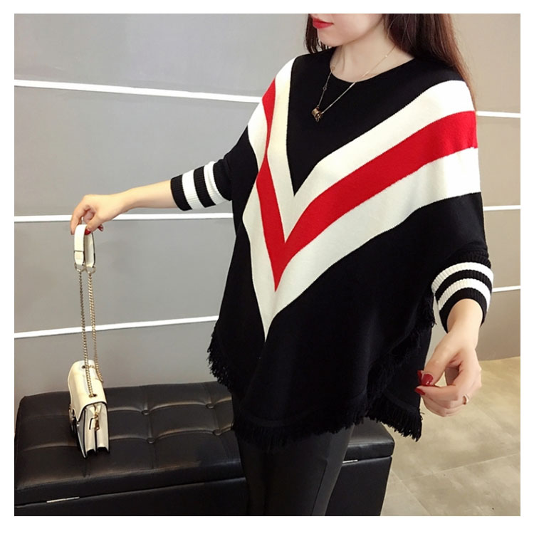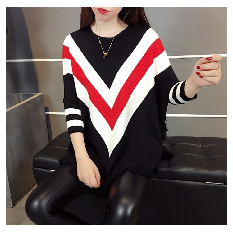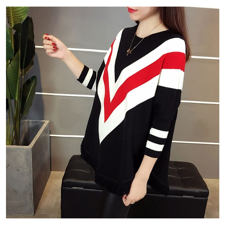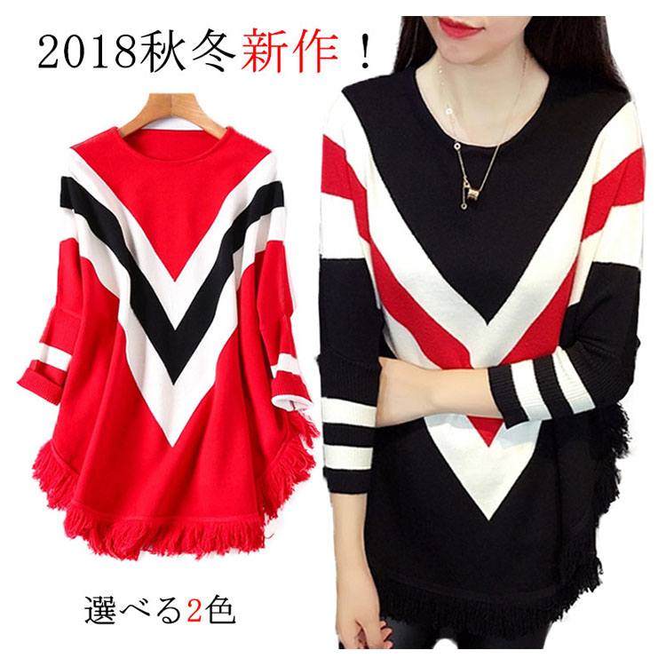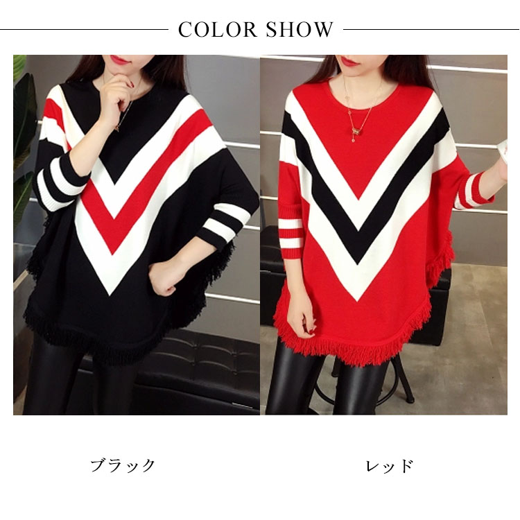 | 2018秋冬新作!フリンジデザインのニットプルオーバートップス。たっぷりとしたドルマンシルエットなので体型カバー効果を演出してくれます。フロントの配色vネックがおしゃれ感も漂います。ヒップにかかるロング丈なので、ジーンズやレギパンなどのタイトボトムスとの合わせがオススメ。 | |