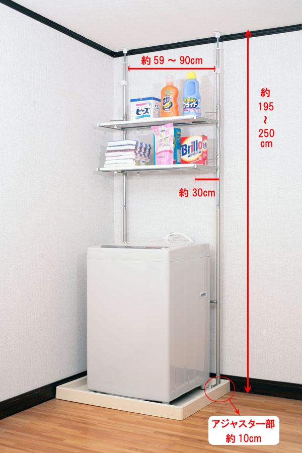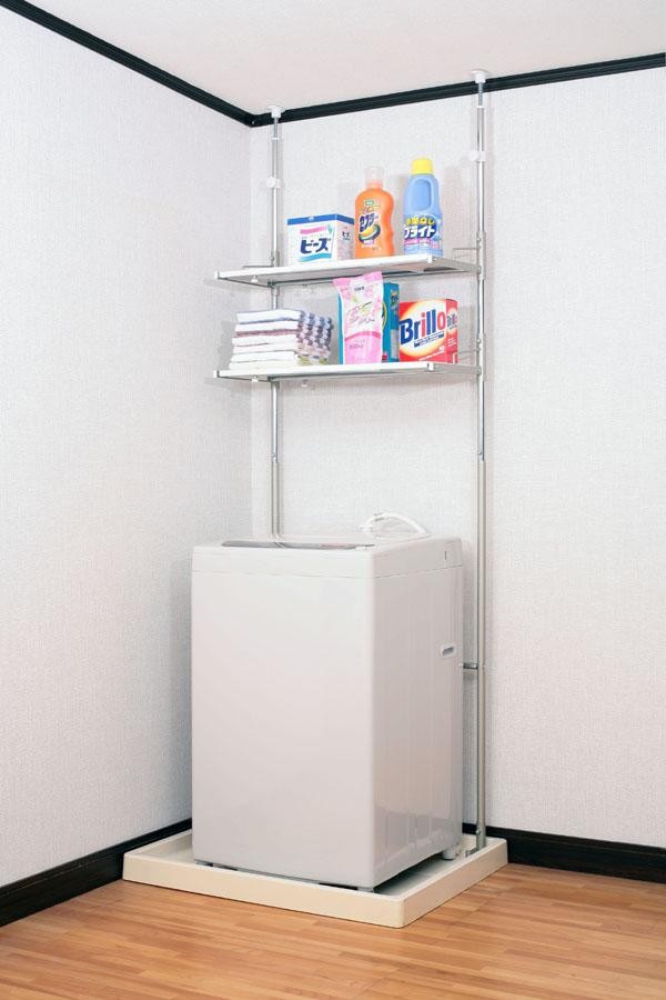 | 洗濯機後部のわずかなすき間に脚部がもぐりこむ形で設置できます。突っ張り式ですので安定性もOK!棚板は通気性の良いパンチング棚。樹脂製ですのでサビの心配もいりません。汚れても簡単に洗えて便利です。棚の高さはお好きな位置に設定できます。 |