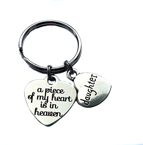 Product Description Keychain, made with a 3/4" x 7/8" or 19mm x 22mm stainless steel "A Piece Of My Heart Is In Heaven" heart charm and an antique silver "Daughter" heart charm. Can be used as a keychain, bag charm, zipper pull, etc. 0
