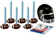 - This festive Football Candle/Cake Top Set captures the flavor of the game. Just peel enclosed decals and attach to center theme topper; insert candles in holders, position topper and get ready to have a ball! Each set includes 1 theme topper (2"x1 1/2"), 6 candleholders (3/4" long), 6 candles (2" tall) and 1 sheet of decals.
