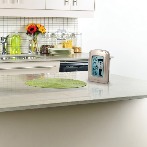 Know at a glance what the weather holds in store, and dress accordingly. This forecaster includes 20 clothing recommendations and nine weather-forecasting icons. The attractive blue LCD also displays indoor and outdoor temperatures, indoor humidity level, weather-trend arrows, and the day, date, and time. Display on a countertop or desktop, or hang on the wall with the built-in hang hole. Powerful outdoor wireless sensor has a range of 160-feet, and also includes hang hole.Feature