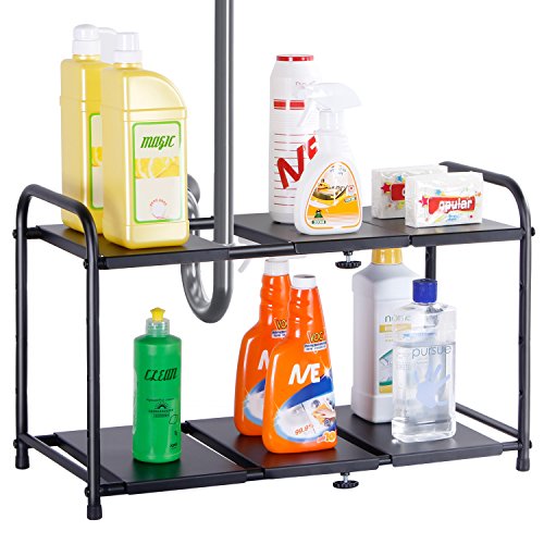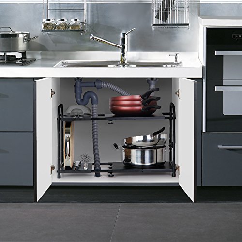 EXPANDABLE & ADJUSTABLE : The Lifewit Under Sink Organization Rack is specially designed to co-exist with placing occupying structures under the sink such as the drain pipe. It features expandable shelf (14.5" to 25.2") to fit different capacities, removable panels to allow space the drain pipe, and adjustable tiers with 5 levels to accommodate different storage needs.