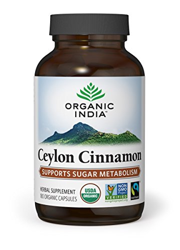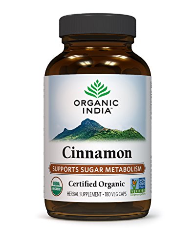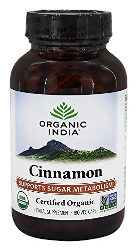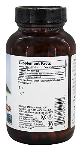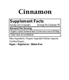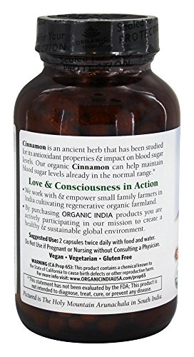 Organic India Natural Cinnamon Capsules are Vegan, Vegetarian, Gluten Free, Non-GMO Project Verified, USDA-Certified Organic, and Kosher and Halal Certified. Suggested serving size is 2 Natural Cinnamon Capsules with food and water. Do not use if pregnant or nursing without consulting a physician.