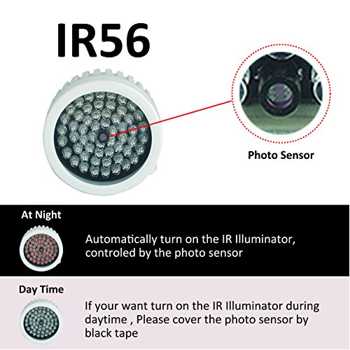 -. Feature : 56pcs ¢8-14μ IR LED , Supports 12V DC input voltage / Ideal for outdoor as well as Indoor applications, IP66 case / Infrared range up to 100 feet (30 meters), light beam angle 60 degree,wave length 850nm / Low operating costs, auto-switch to ON when available light is under 10Lux by CDS / 1A 12VDC Power Adaptor included