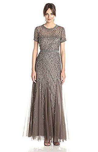 Short-sleeve gown in allover sequin pattern with illusion neckline, wide beaded trims, and layered tulle skirt