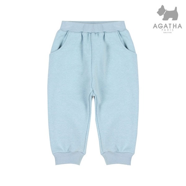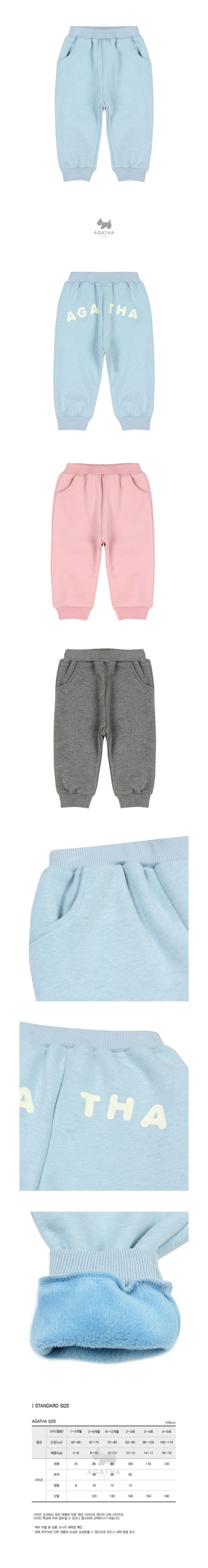 스판성 좋은 롱기모 져지 소재를 사용한 공용 배기 팬츠로 엉덩이에 아가타 레터링 나염으로 포인트를 준 스타일입니다.