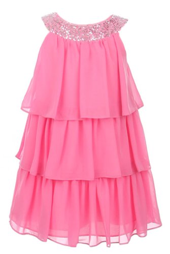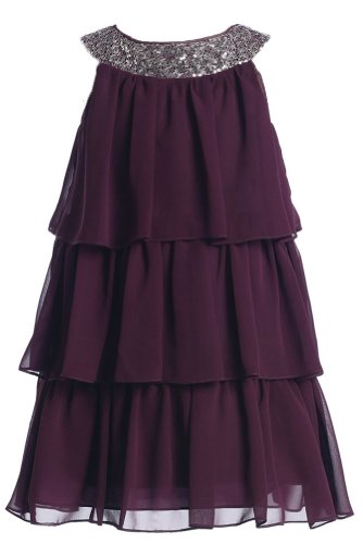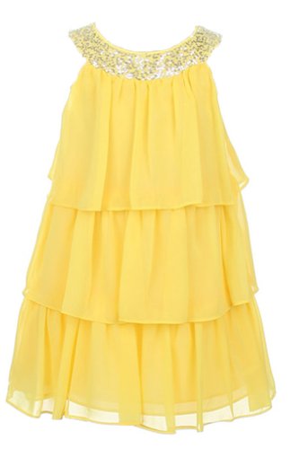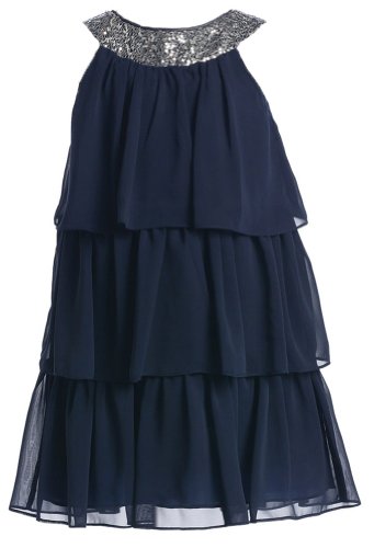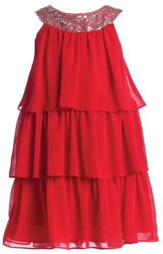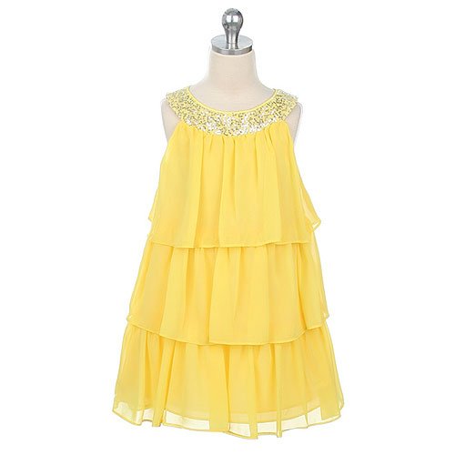 New Triple Tiered Chiffon Dress with Sequined Trimmed High Circle Neckline; Knee Length Design Multiple Ruffled Chiffon Layers; Fully Lined with Back Zippered Closure; 100% Polyester - Made in USA.Feature