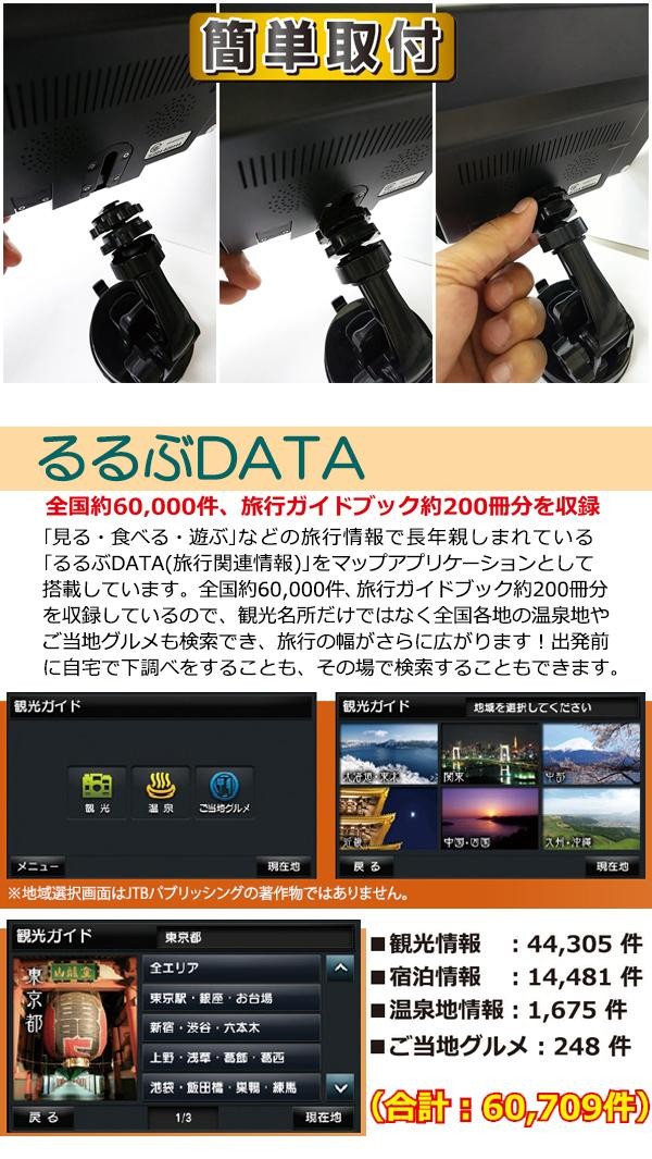 | 大画面の9インチ液晶を採用!!視認性アップはもちろん、タッチパネルの操作性も良くなります♪また、旅行情報で長年親しまれている「るるぶDATA(旅行関連情報)」をマップアプリケーションとして搭載。観光名所だけではなく全国各地の温泉地やご当地グルメも検索でき、旅行の幅がさらに広がります!!充電バッテリーが内蔵されており、持ち運びも可能なので、出発前に自宅で下調べをすることも、その場で検索することもできます。 |