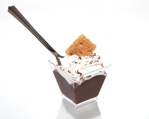 -. Feature : PERFECT FOR ANY OCCASION OR CELEBRATION. IMAGINE THE POSSIBILITIES! Make the perfect Jell-o shots for your bachelorette party. Create delectable chocolate mousse cups for your bridal shower or wedding. Use the small dessert shooters to present your delightful mini cheesecakes at your daughter's baby shower. Use these dessert shooter glasses as self serve dip cups at your kid's birthday party or candy cups at your holiday party. / MODERN SHAPE AND SMALL SIZE CREATE AN ELEGANT EXPERIENCE FOR YOUR GUESTS WITHOUT THE GUILT OF EATING A FULL SIZED DESSERT! These cute dessert shot glasses are the perfect size for "small bites" or tapas style dinner parties or even a child's tea party. The dessert glasses hold 2 ounces of your delicious creation and are about the size of a shot glass. The stylish square design is 2x2 inches at its opening, 1.125x1.125 inches at its base and 1.75 inches tall. / DURABLE, EASY TO USE AND RESTAURANT QUALITY. WILL NOT BREAK OR CRACK UNDER NORMAL USE. The clear disposable dessert cups are made of durable BPA-free polystyrene and unlike other brands, these plastic dessert cups do not stick together in their packaging, making them easy to quickly grab and use while preparing your delectable desserts! The dessert forks and spoons are made of heavy weight plastic. Under normal use they will not break. / DISPOSE FOR QUICK AND EASY CLEANUP or SPEND YOUR MONEY ONCE BY WASHING AND REUSING THEM FOR YOUR NEXT EVENT! Purchase once and use them over again for many different occasions or make life easy and toss them into the recycle bin. The choice is yours! We recommend hand washing in order to maintain the quality and appearance of your plastic shooter glasses, mini dessert spoons and forks. / ASTONISH YOUR GUESTS WITH SOPHISTICATED PRESENTATION, ELEGANCE AND CHOICES. The crystal clear premium plastic dessert shooter cups will showcase your creations in a flattering light. The stainless steel look of the mini plastic flatware will seamlessly compliment your desserts. Feel free to provide a variety of dessert choices and allow your guests choose whether they would prefer a fork or spoon. Guaranteed to impress your guests or your money back with our 30 day no risk guarantee!
