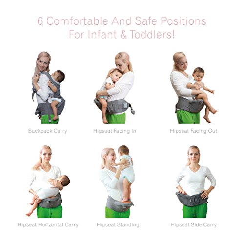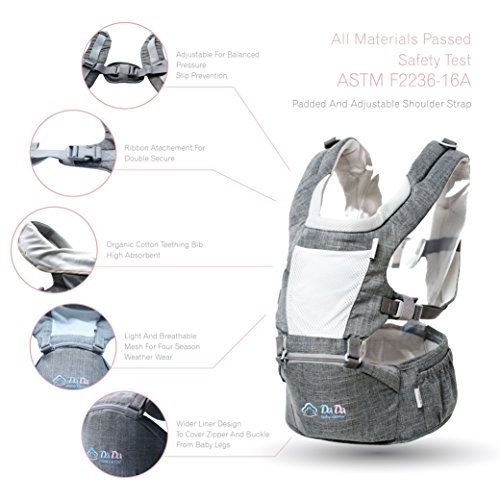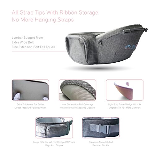 -. Feature : ADVANTAGE VERSES TRADITIONAL BABY CARRIERS: Hipseat carry allows more movements and air flow for the baby; easy to put on and ready to use in seconds, hop on and off in seconds without the hassle of fumbling with all the straps to get the baby into and out of the baby carrier or backpack / MULTIPLE WAYS TO CARRY YOUR BABY: Single hipseat use: baby could lay flat before she/he could sit up; baby could face inward or outward once she/he could sit up, baby could sit on hip side, or stand on the hip seat with secured support; Full baby carrier: facing inward or outward for front carry; backpack position (front facing only) / RECOMMENDED BY CHIROPRACTOR:DADA hipseat baby carries takes most of baby's weight for light and easy carrying, it takes pressure off the hips and arms, light and easy on the back and shoulders for longer baby holding/carrying all day around the house or outdoor / USER FRIENDLY DETAILS: Breathable mesh seat top and front cover for air flow, care easy and sturdy fabric, machine washable, no stain from color;Light weight; Zippered side pocket on the waist belt for storage of phone, keys and small items; New generation Velcro with full coverage for easy and more secured closure, soft hooks on sweaters or materials alike / FITS ALL FAMILY MEMBERS: Adjustable waist belt and shoulder straps fit both mom& dad Wide padding for adjustable waist and shoulder strap, 44ft (1.4Meter) for waist belt; fits for babies up to 36months or 33 lbs.