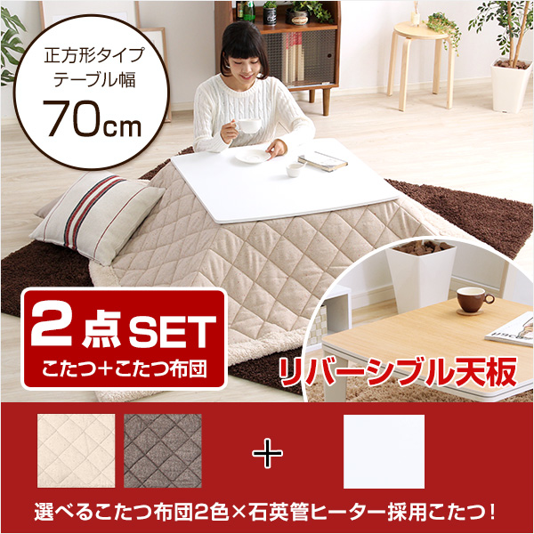 ●70cm幅・清潔感のあるオフホワイトのこたつテーブルとこたつ掛布団が付いた2点セット!