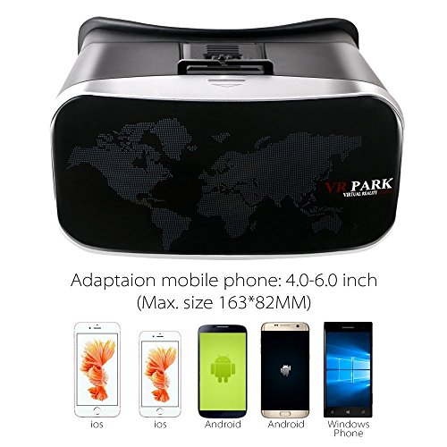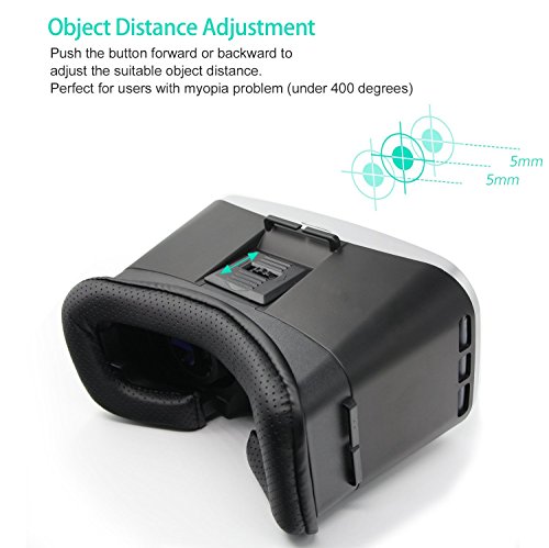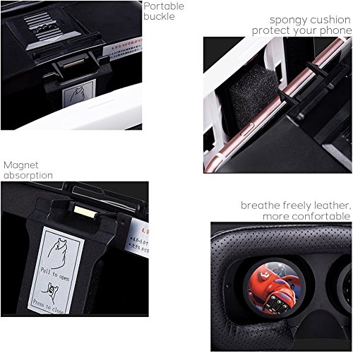 -. Feature : Amazing revolutionary tech, turn your Smartphone into a virtual reality viewer. You can experience the immersive, fun and exciting world of VR. Fly through the Grand Canyon, play 3D games, travel the city streets or become a character in an animated film. / Use high quality ABS and resin lens material without stimulation plastic sheet, environmental, high quality, lowering down the distortion to the minimum when magnifying the images and providing wider view; You will not feel visual fatigue and dizzy even you use it for a long time because of the resin lens. / Easy to put your smart phone into the 3D glasses - Easily pull the smart phone storage box out, then put your smart phone in it. Perfectly suitable your face when you wear the 3D VR glasses; You can get free from your glasses while enjoy the 3D movies or games with the virtual reality glasses, bringing you better experience. / Adjustable on pupil distance and object distance, satisfying different groups of people. Optical Axis Sliding Control function: You can slightly adjust the position of the spherical resin lens through moving the button on the top of the 3D VR Glasses so as to get a better experience of watching movies. You can get a viewing angle of between 70 to 80 degrees/ FOV / Suitable for almost all kinds of smart phones (Android / IOS, etc) that screen between 4.0~6.0 inches; Both sides holes of the 3D VR glasses is specially designed for the headset / data / charge cable, letting you charge your smart phone (You had better not charge your phone during enjoying movies).
