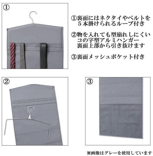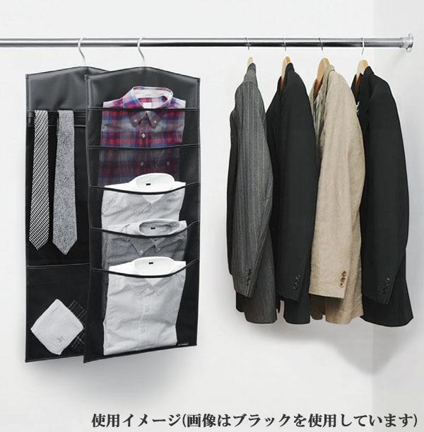 | ワイシャツをまとめて省スペース収納できる便利なワイシャツケースです。裏面にはネクタイやベルトが5本掛けられるループと、小物などを収納できるメッシュポケットが付いています。360度回転するアルミハンガーで色々なところに掛けられます。 |